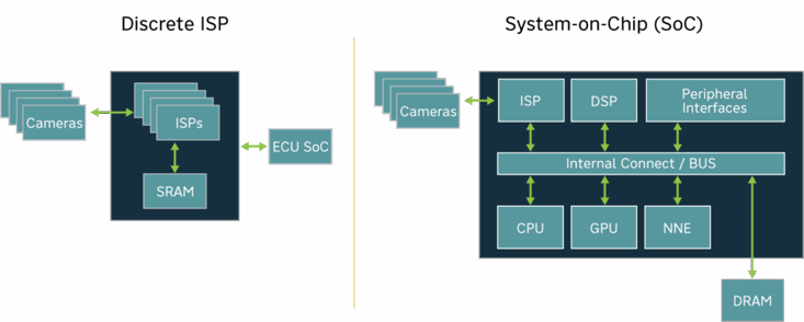 多くの主流の車載アプリケーションでは、SoCに統合されたISPで「十分」です。つまり、ほとんどの場合ビデオ品質は許容範囲内です。例外は車載特有の例外的なケース、つまり同等の品質レベルで処理されない、あまり一般的ではないシナリオです。ISPの統合により、個別のISPと関連する相互接続が不要になり、部品点数、消費電力、システムコストが削減されます。
