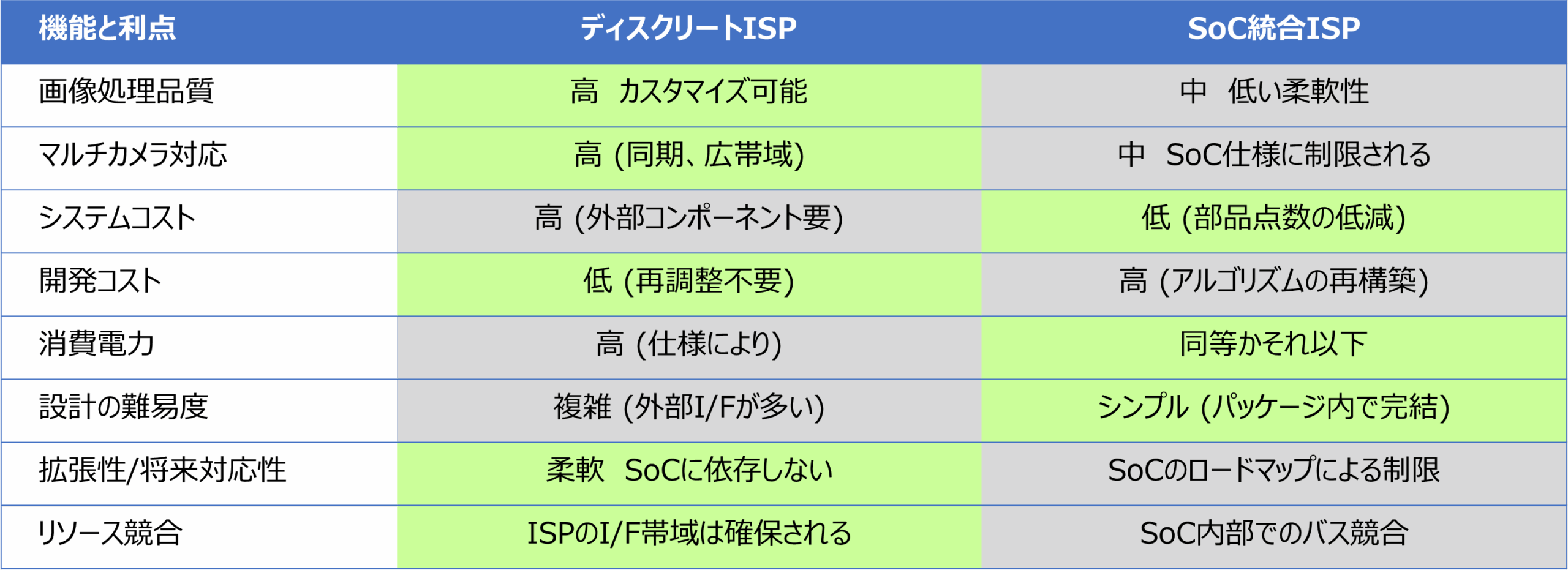以下の表でディスクリートISPとSoC統合ISPの比較を示します。